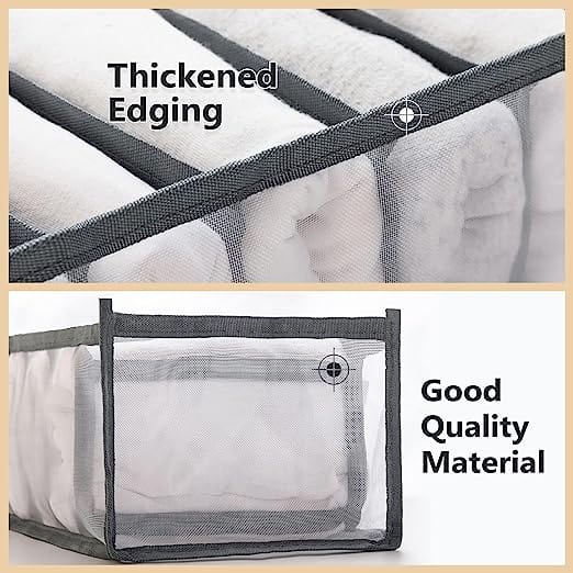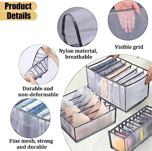 - صندوق مكون من 6 شبكات (للأوشحة وحمالات الصدر)، صندوق بـ 7 شبكات (للملابس الداخلية، السراويل الداخلية، ربطات العنق)، صندوق من 11 شبكة (مثالي للجوارب). 9 شبكات أكبر (للملابس الرقيقة) أكبر من 12 شبكة (للبناطيل الضيقة والتنانير والقمصان والسراويل الجينز)